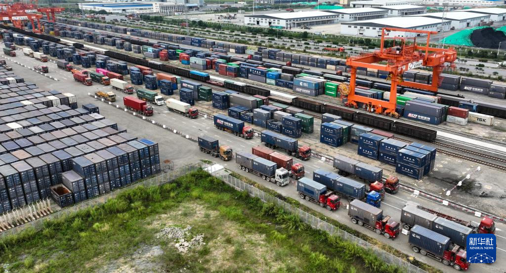 9月23日,在钦州铁路集装箱中心站,货车排队转运卸集装箱(无人机照片)。