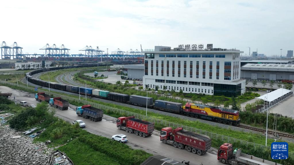 在钦州港,火车与货车在紧张运输货物(9月23日摄,无人机照片)。