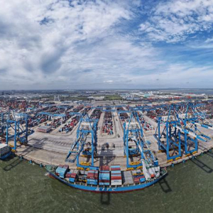 9月23日,海轮在钦州港码头下卸集装箱(无人机照片)。