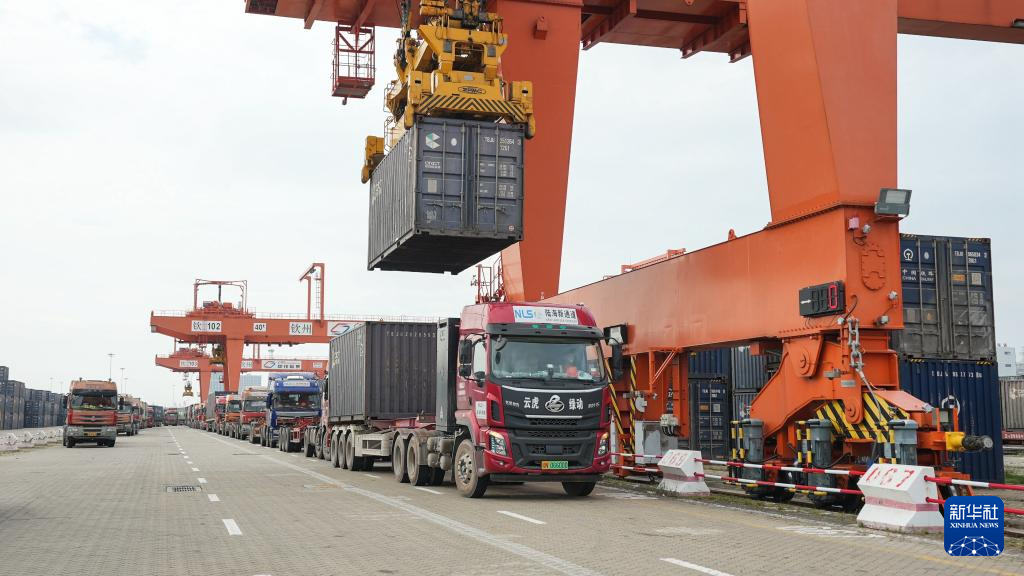 9月23日,在钦州铁路集装箱中心站,货车在转运集装箱。