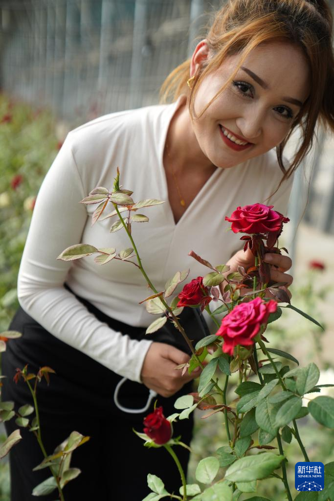 9月22日,在新疆喀什地区英吉沙县戈壁设施农业产业园,员工阿斯姆古力在观赏喀什红玫瑰。喀什红玫瑰等鲜切花出口吉尔吉斯斯坦等中亚国家。据了解,该产业园是山东省援疆指挥部产业援疆重点发展项目之一,一期占地面积1037亩,建设戈壁智能日光温室大棚233座,种植花卉、蔬菜等作物,年产值约5000万元,带动当地1500多名农民就业。