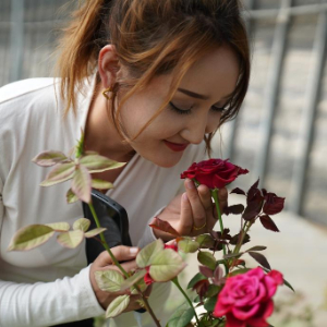 9月22日,在新疆喀什地区英吉沙县戈壁设施农业产业园,员工阿斯姆古力在闻玫瑰花香。喀什红玫瑰等鲜切花出口吉尔吉斯斯坦等中亚国家。据了解,该产业园是山东省援疆指挥部产业援疆重点发展项目之一,一期占地面积1037亩,建设戈壁智能日光温室大棚233座,种植花卉、蔬菜等作物,年产值约5000万元,带动当地1500多名农民就业。