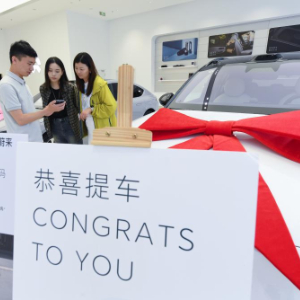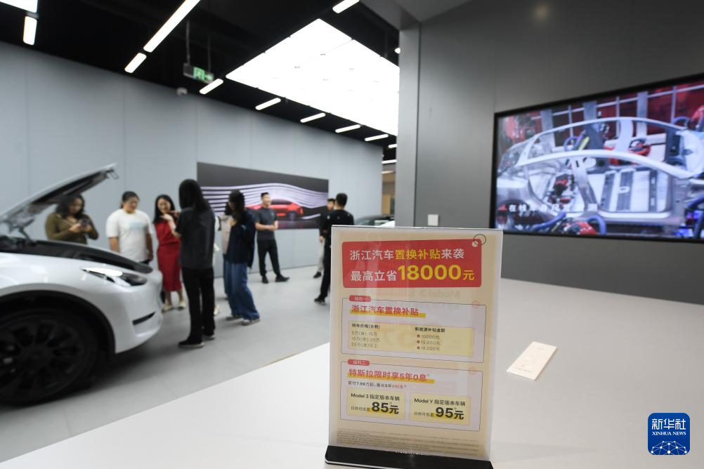 9月25日,人们在位于湖州市爱山街道的特斯拉体验店了解汽车性能和购车优惠。