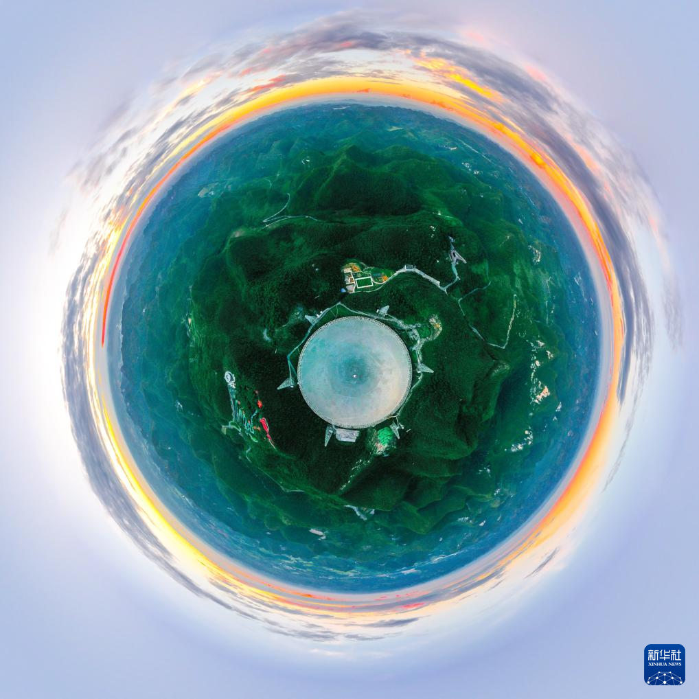 2019年8月28日,落日余晖中的“中国天眼”宛如“火眼金睛”(无人机全景照片,维护保养期间拍摄)。