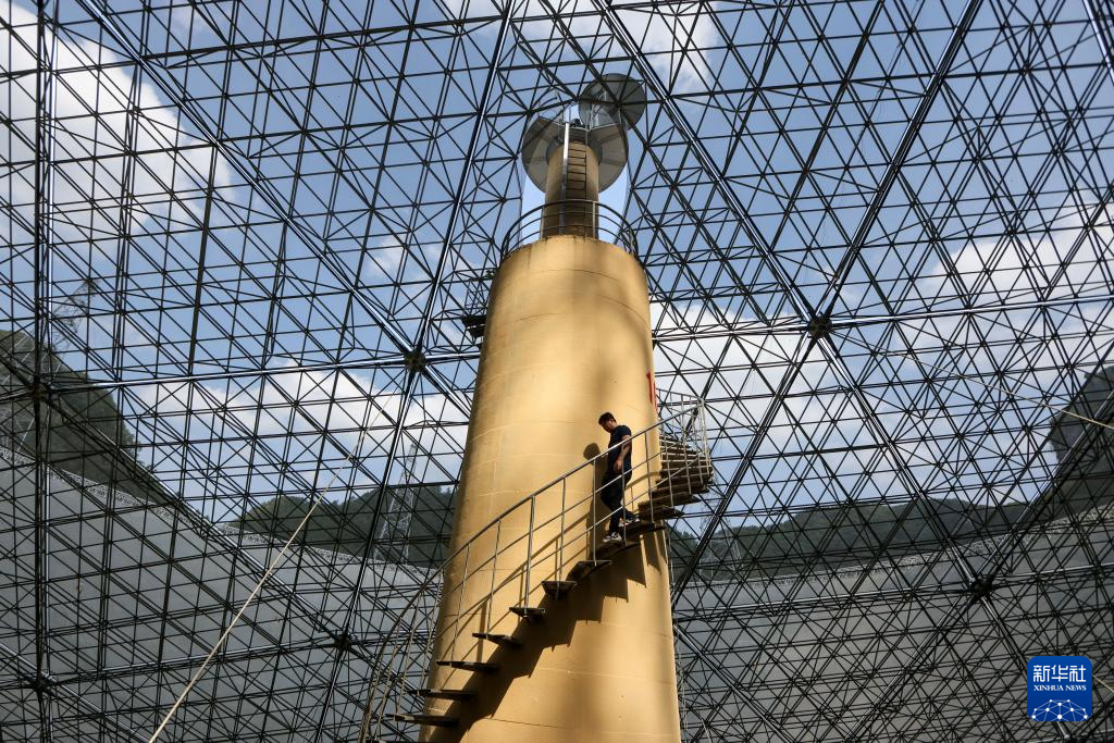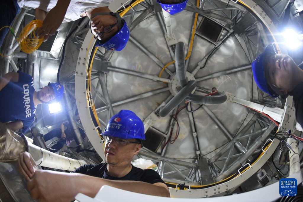 2017年8月10日,工作人员在“中国天眼”馈源舱内工作。