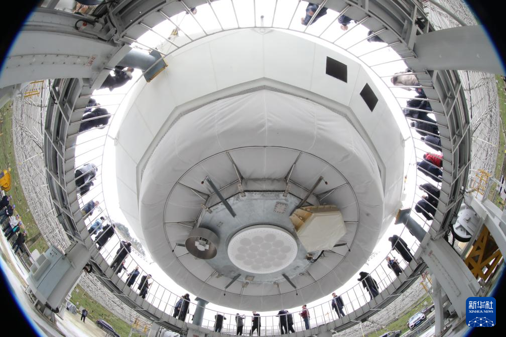 2016年4月10日,工作人员在安装“中国天眼”馈源舱(无人机照片)。
