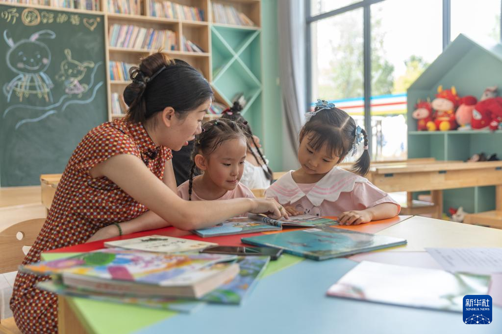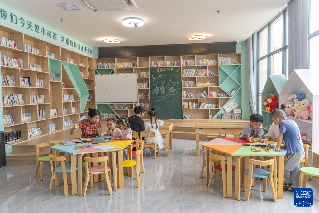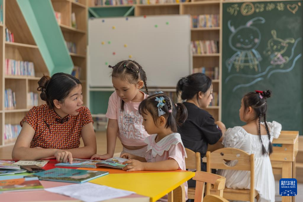 9月25日,在重庆市江津区珞璜镇碑亭社区,社区居民郭明会(左一)带着小孩阅读用社保卡借阅的图书。