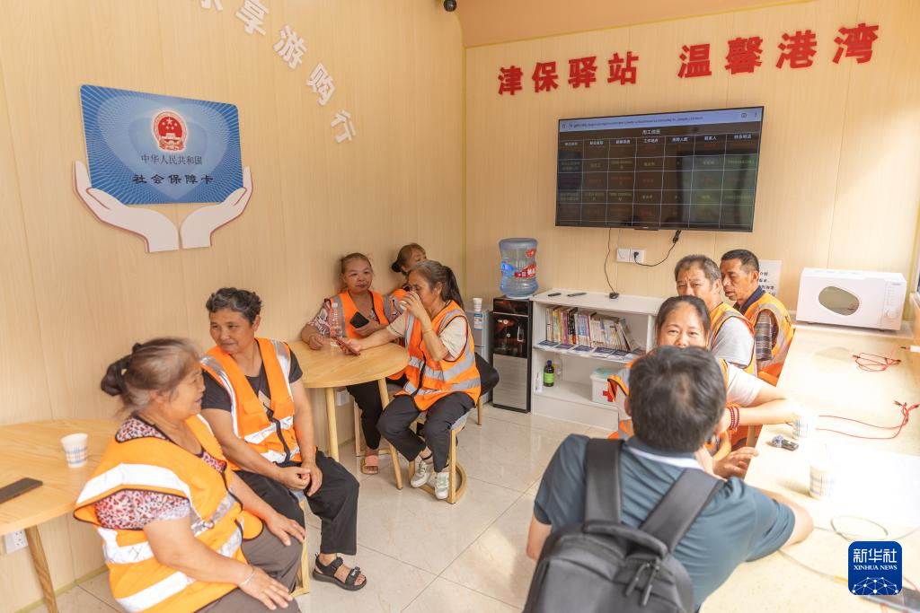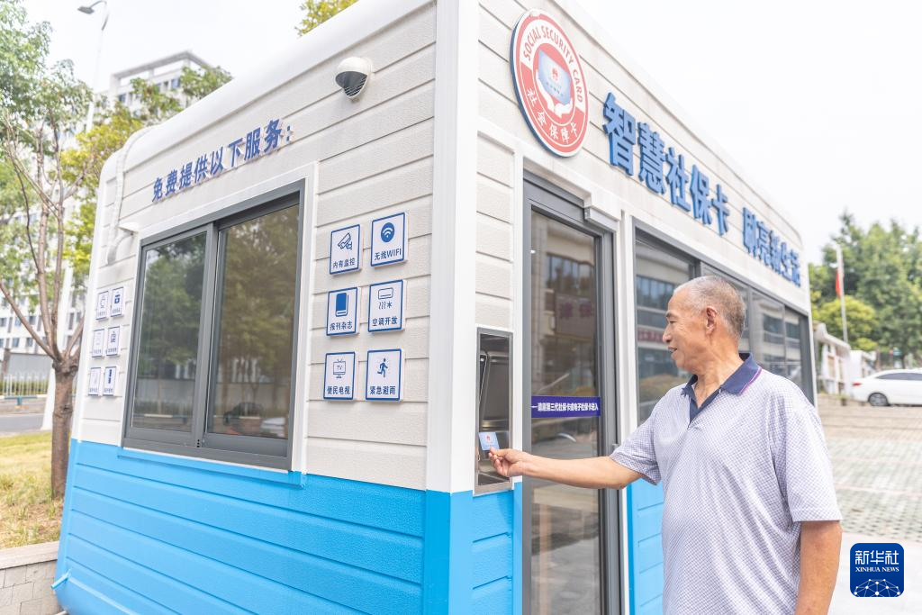 9月25日,在重庆市江津区珞璜镇碑亭社区,社区居民刷社保卡进入津保驿站休息。