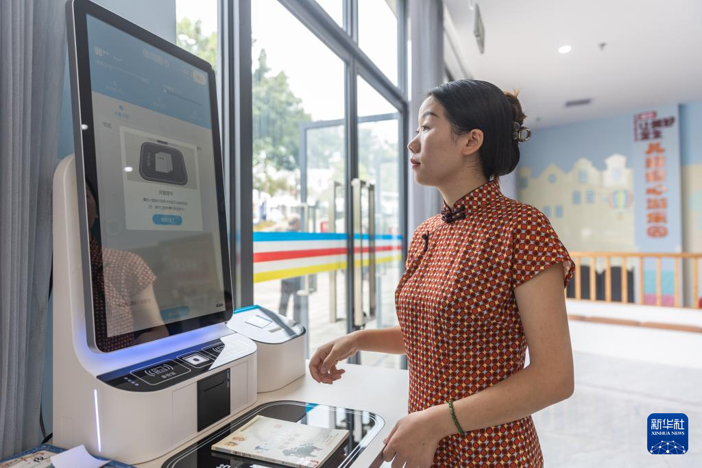 9月25日,在重庆市江津区珞璜镇碑亭社区,社区居民郭明会刷社保卡借阅图书。