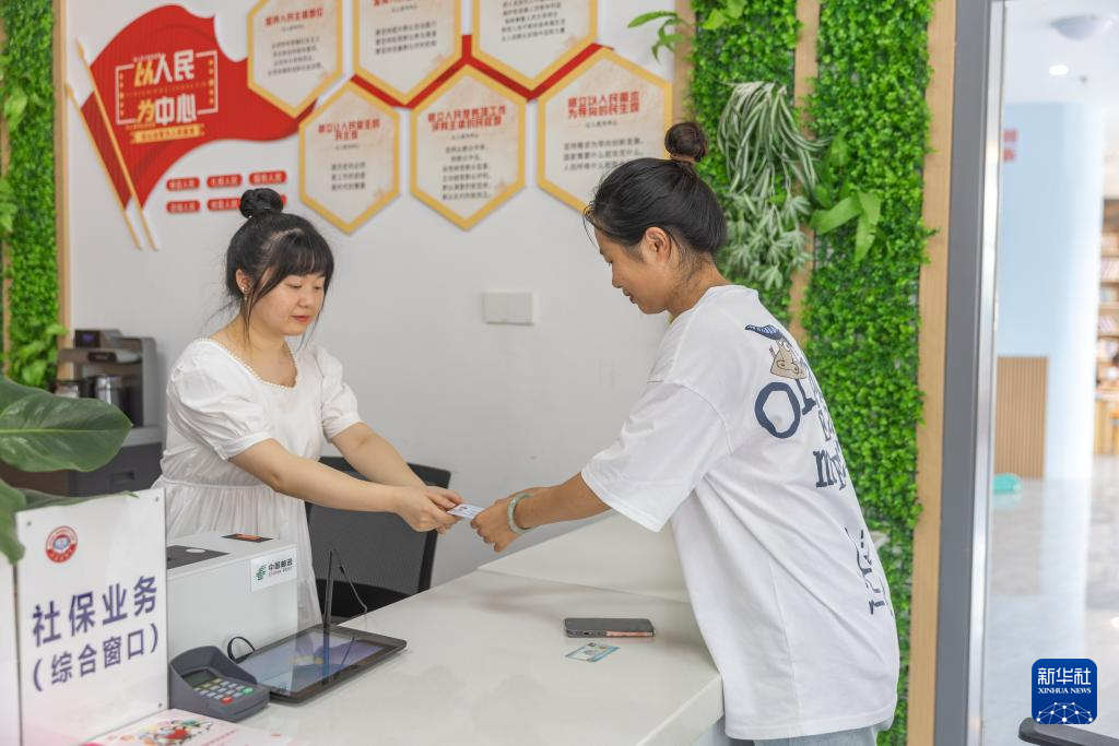 9月25日,在重庆市江津区珞璜镇碑亭社区办事窗口,社区居民前来领取新办理的第三代居民社保卡。
