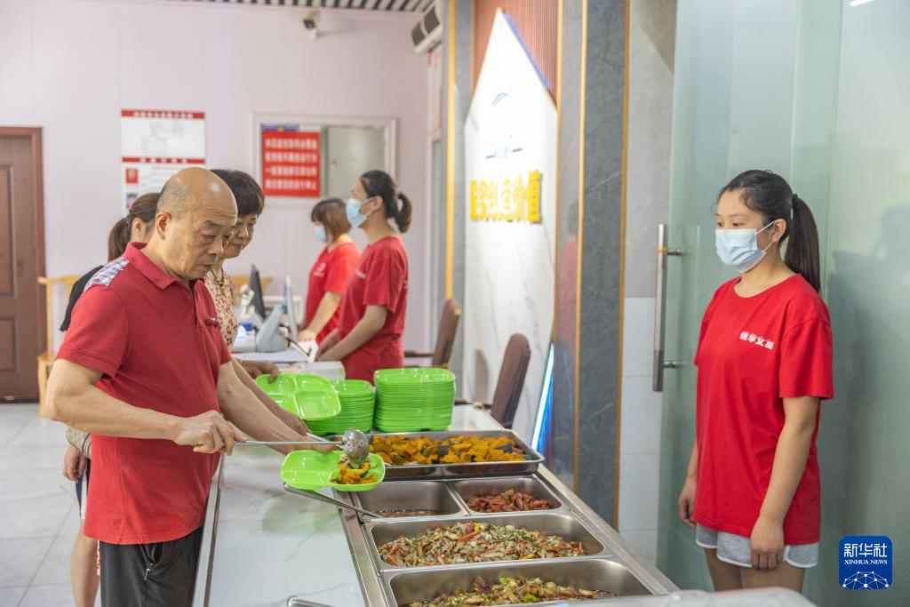 9月25日,在重庆市江津区珞璜镇碑亭社区,社区居民在社区食堂内刷社保卡后排队自助取餐。