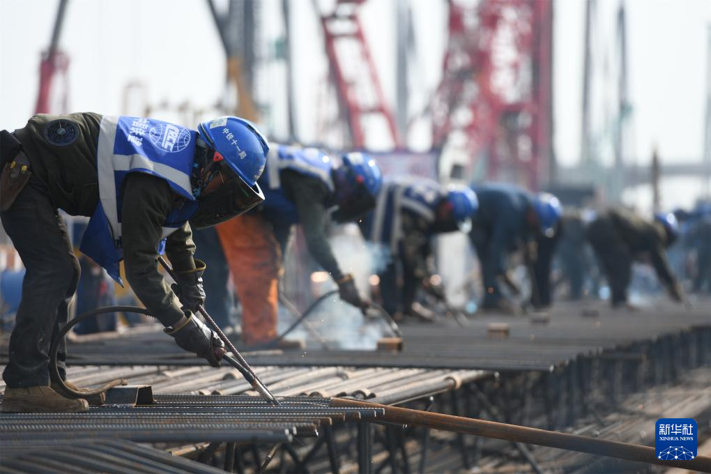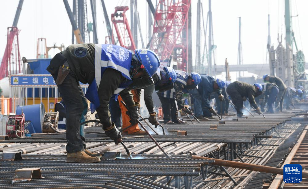 胡建国(左一)和工友一起焊接钢筋笼(8月27日摄)。