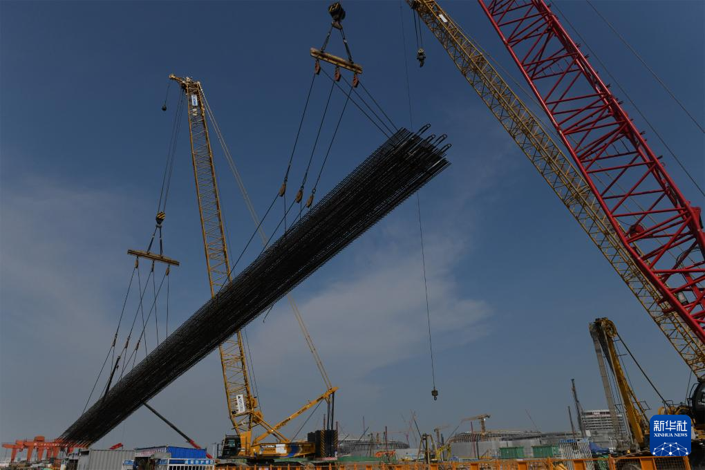 履带吊正在把加工好的钢筋笼从工作台上吊往施工地(8月27日摄)。