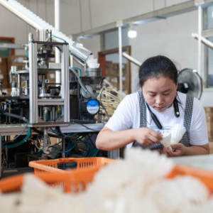9月24日,在位于安徽省芜湖市无为市的一家体育用品公司,工作人员在羽毛球生产车间内工作。