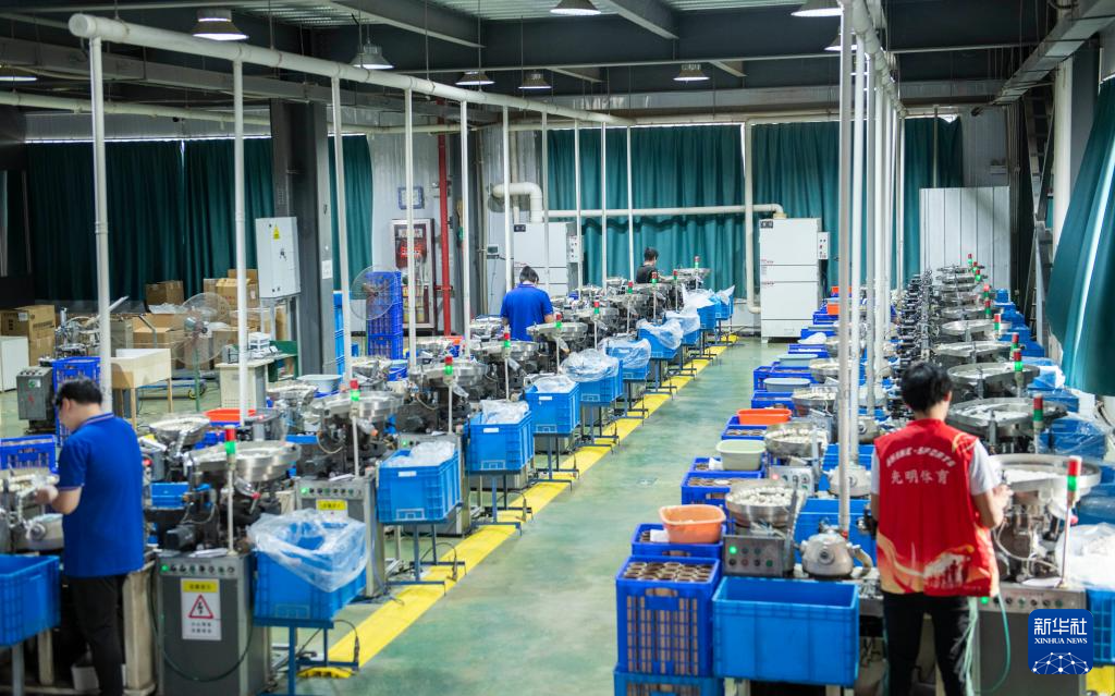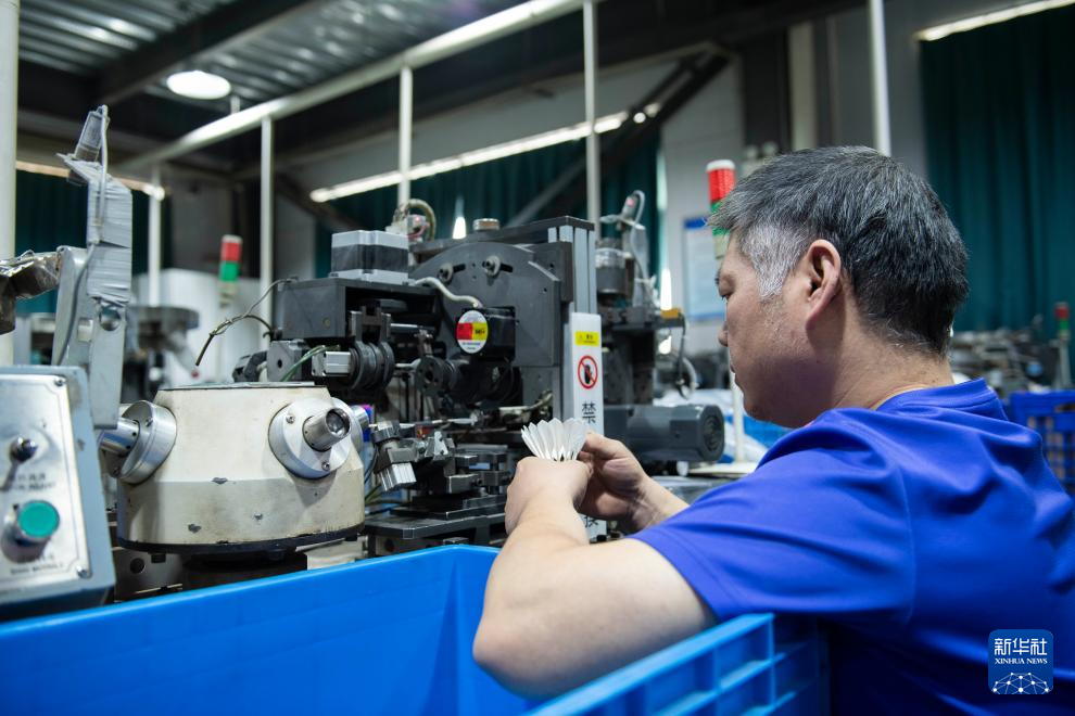 9月24日,在位于安徽省芜湖市无为市的一家体育用品公司,工作人员在注胶操作间检查注胶后的羽毛球产品。