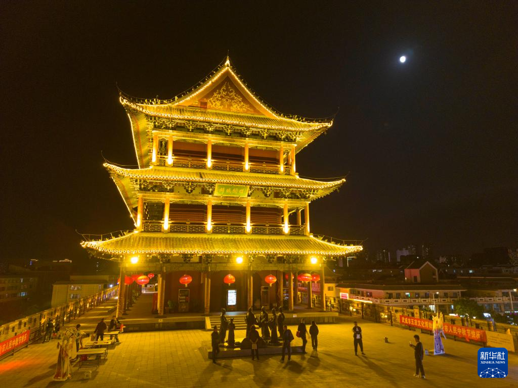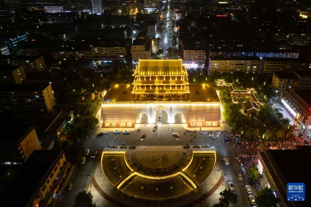 7月10日拍摄的武威南城门夜景(无人机照片)。