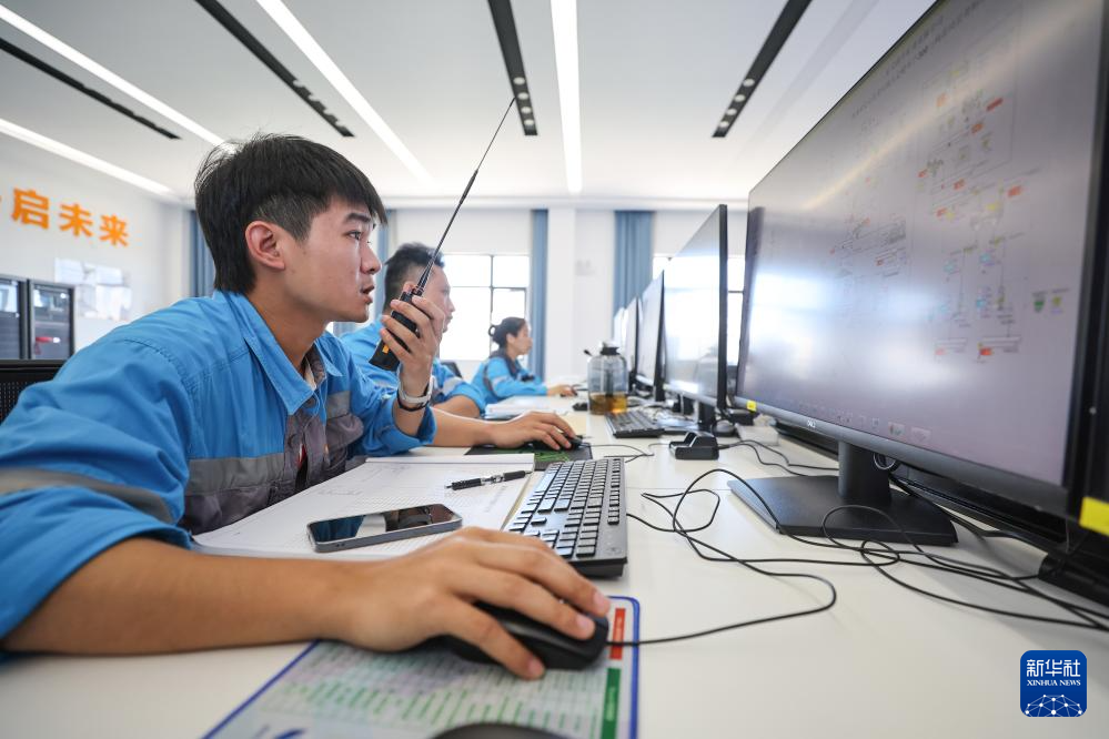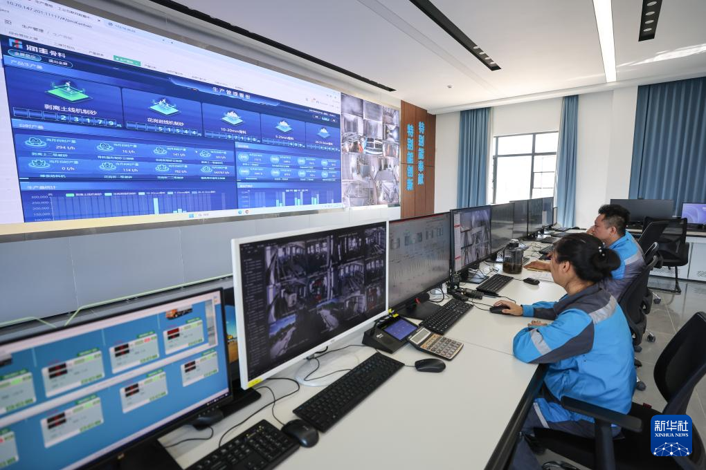 9月25日,海南省定安县九定岭矿山建筑用花岗岩骨料项目的工作人员在中央控制室远程操作自动化生产设备。