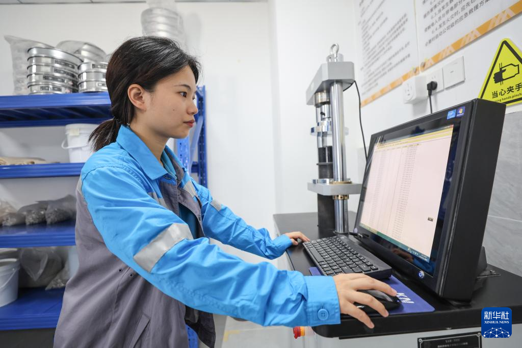 9月25日,海南省定安县九定岭矿山建筑用花岗岩骨料项目的工作人员在做花岗岩样品的压力试验。