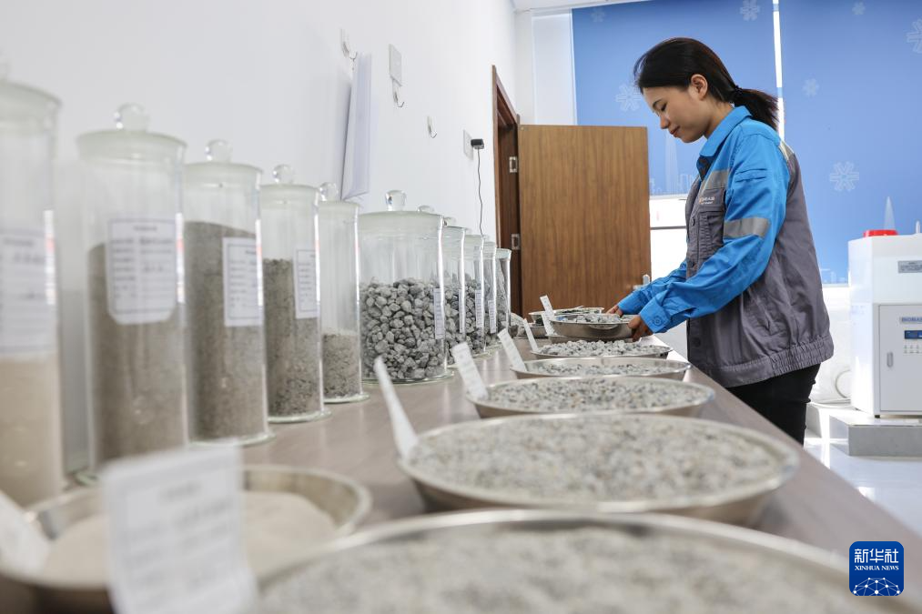 9月25日,海南省定安县九定岭矿山建筑用花岗岩骨料项目的工作人员在实验室整理花岗岩样品。