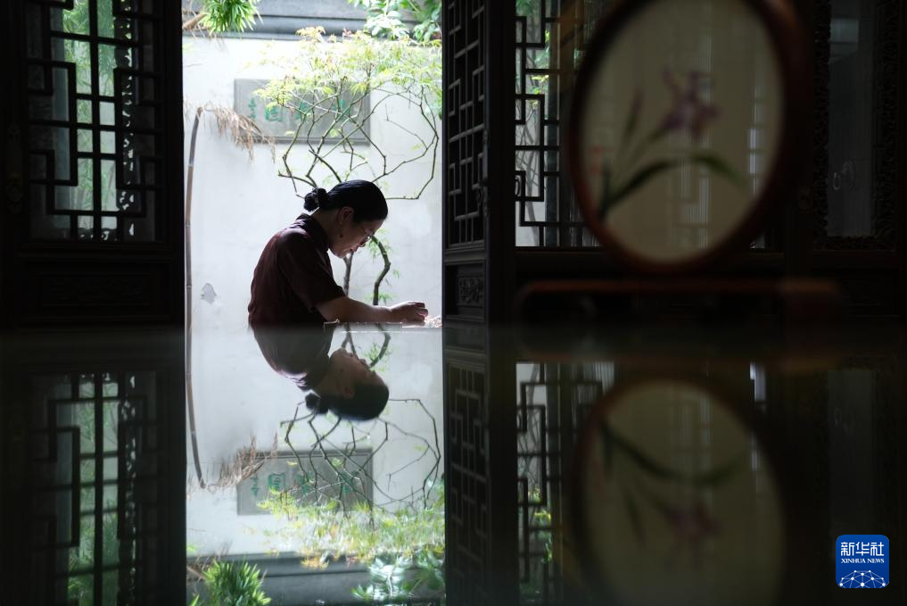 9月25日,卢建英在“观绣园”传习所内刺绣。