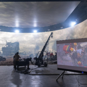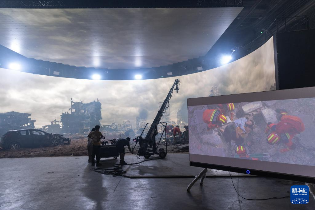 9月26日,在重庆市永川区科技片场一期,工作人员在演示LED虚拟拍摄系统。