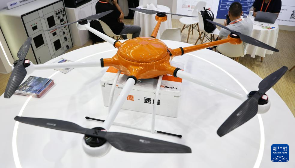 9月25日在第21届中国—东盟博览会数字技术展区拍摄的一款速递无人机。