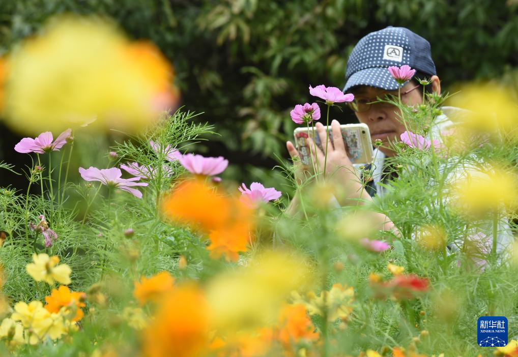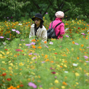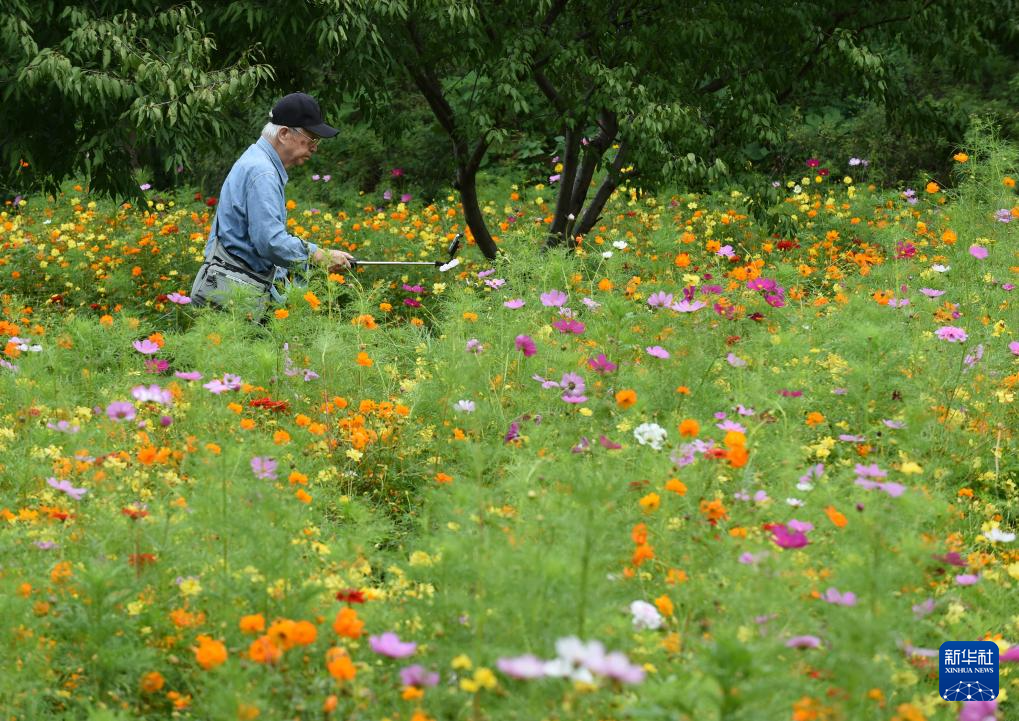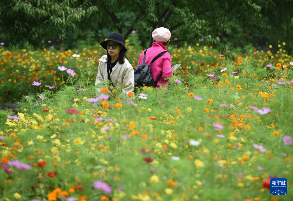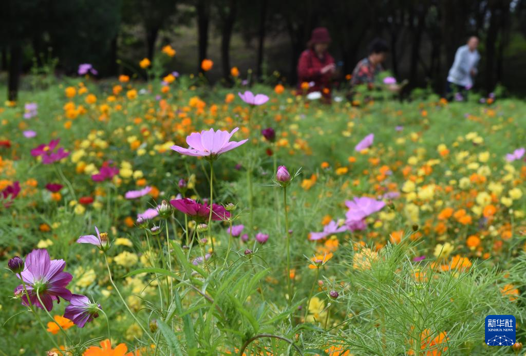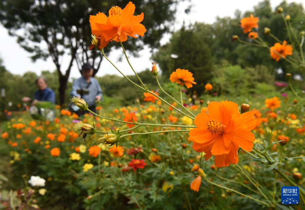 9月26日,游客在北京圆明园内月地云居附近的花海游览、拍照。