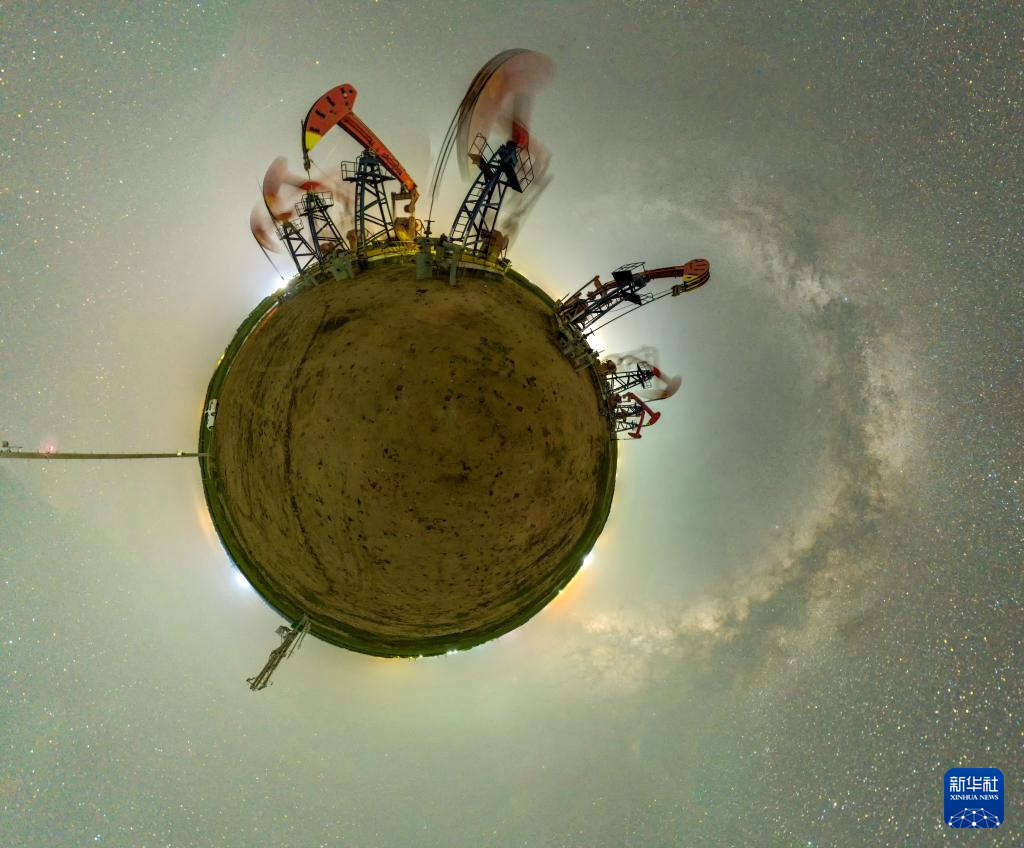 8月2日拍摄的星空下的大庆油田采油九厂采油平台(拼接照片)。