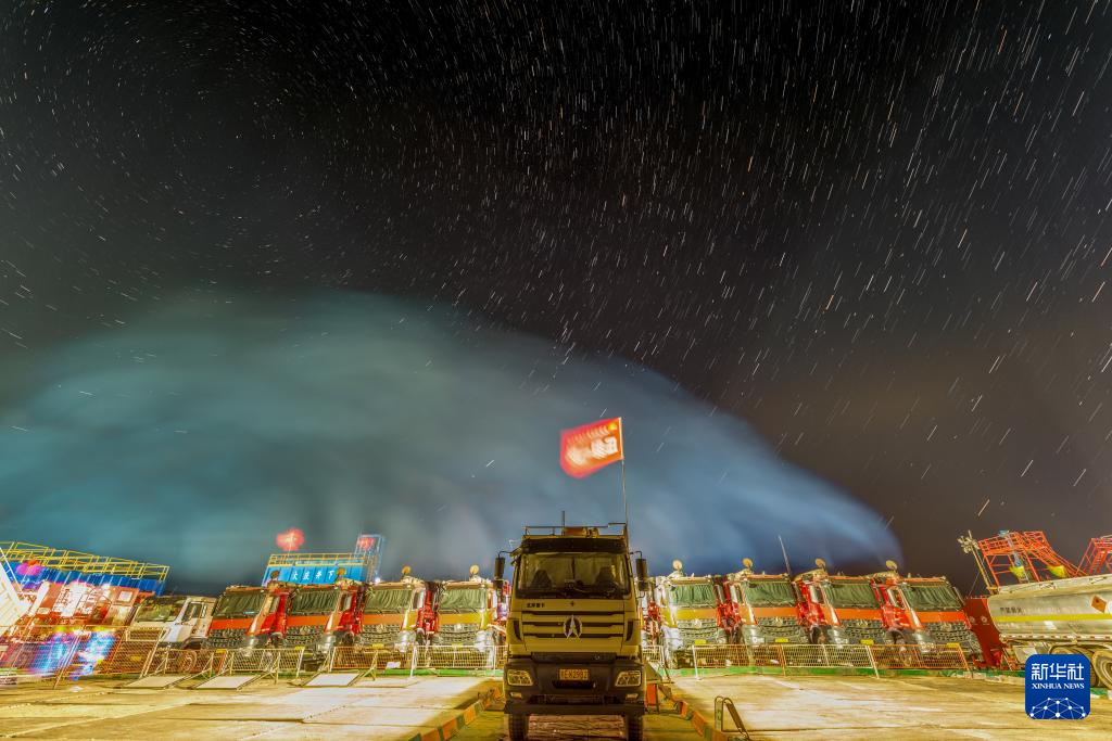 9月23日拍摄的星空下的大庆油田古龙页岩油实验区压裂现场(堆栈合成照片)。