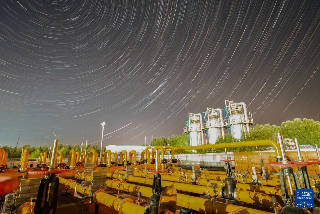 9月22日拍摄的星空下的大庆油田天然气分公司的油气储运管线(堆栈合成照片)。
