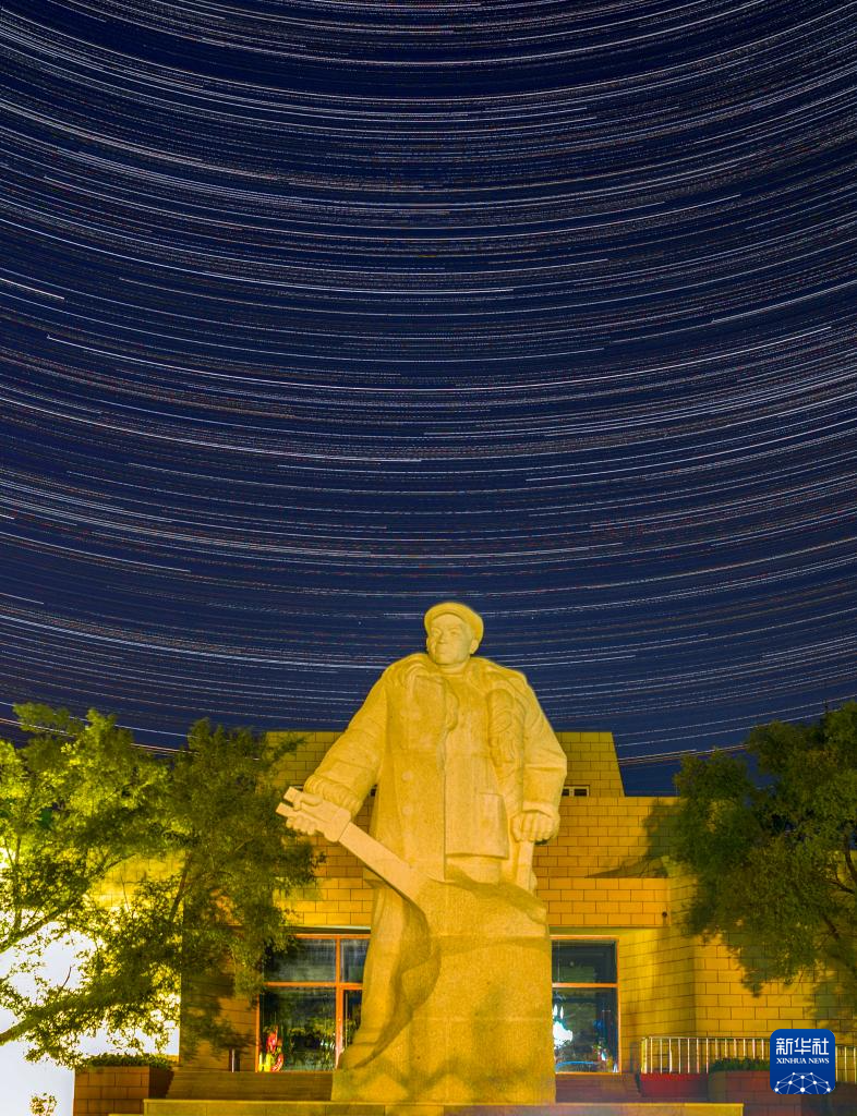 9月2日拍摄的星空下的大庆油田铁人一口井教育培训基地内的铁人王进喜雕像(堆栈合成照片)。