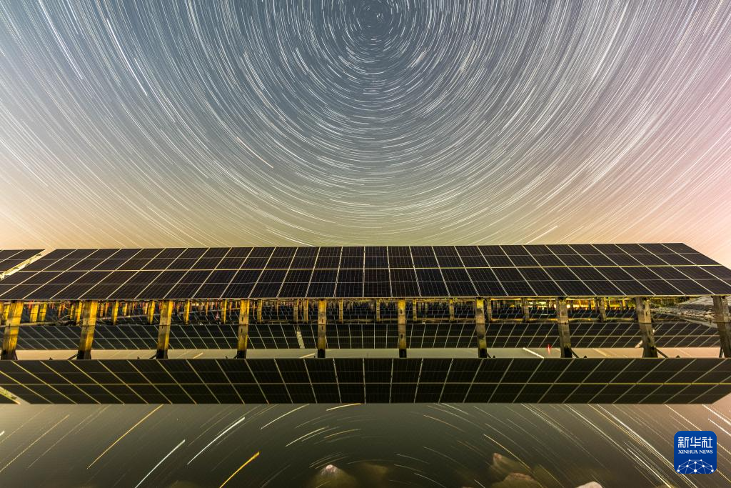 9月5日拍摄的星空下的大庆油田星火水面光伏电站(堆栈合成照片)。
