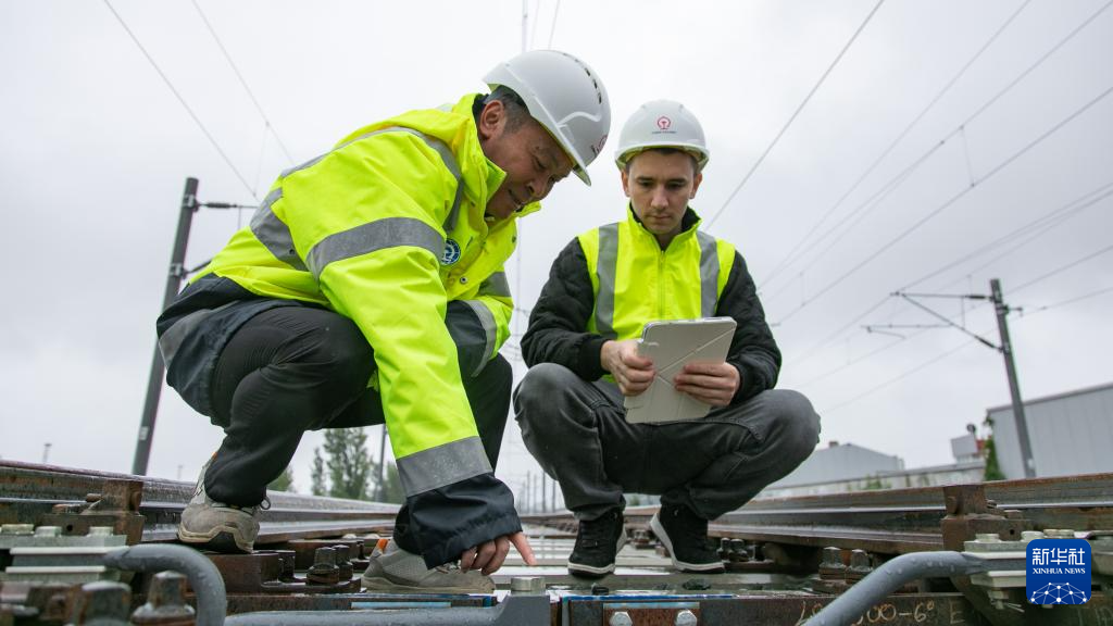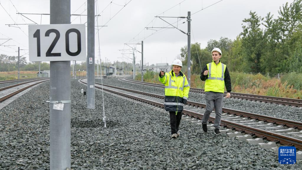9月16日,在塞尔维亚诺维萨德的匈塞铁路塞尔维亚段项目部营地,段伟(左)与外籍员工检查轨道施工情况。