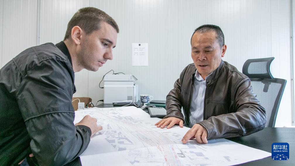 9月16日,在塞尔维亚诺维萨德的匈塞铁路塞尔维亚段项目部营地,段伟(右)与外籍员工讨论施工图纸。