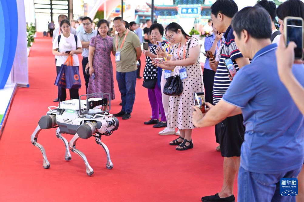 9月27日,观众在中国—东盟博览会上参观机器狗。