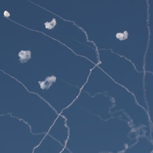 9月26日,在以色列北部塞费德,火箭弹被以色列防空系统拦截后留下烟轨。