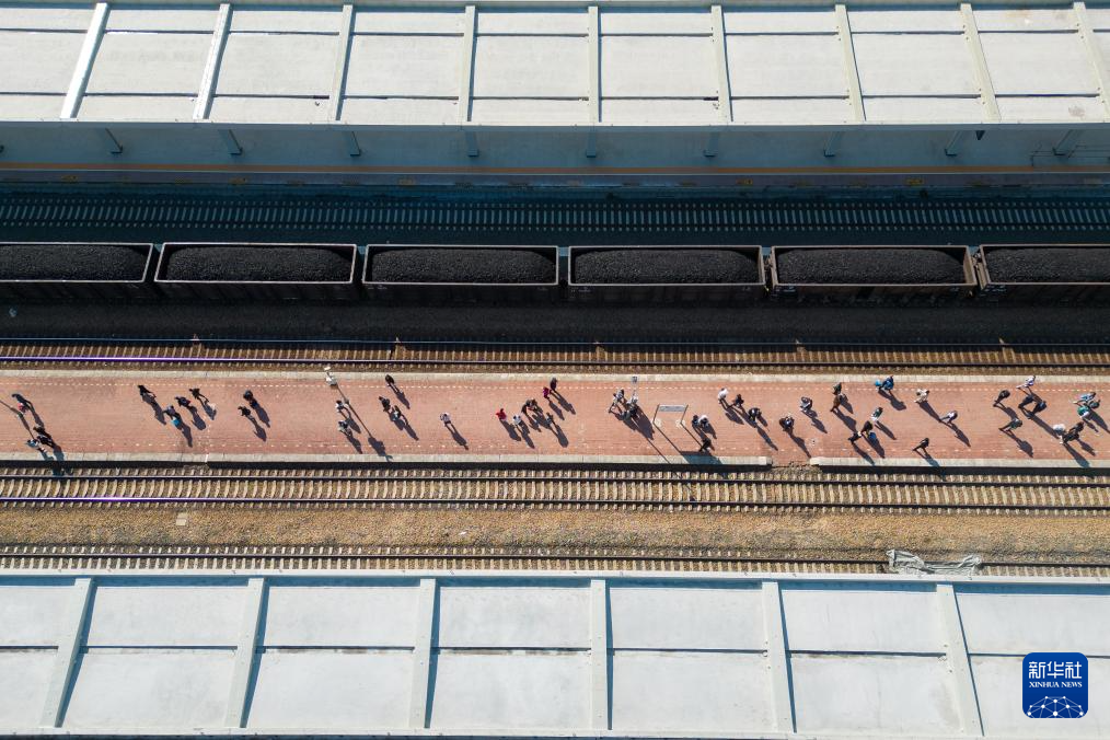 9月27日,乘客在铁力站准备乘坐火车(无人机照片)。