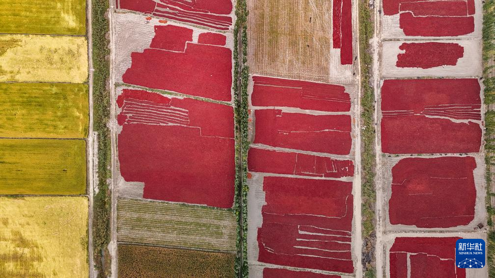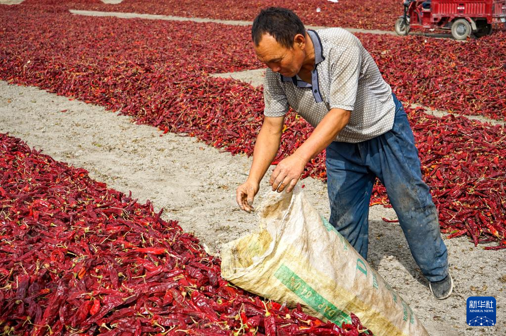 眼下正是新疆辣椒丰收的好时节。在新疆巴音郭楞蒙古自治州博湖县辣椒晾晒场上,村民抢抓晴好天气,对收获的辣椒进行集中晾晒、分拣、装袋。