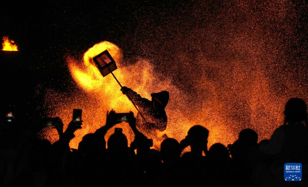 9月21日,在山东省海阳市凤凰广场,民间艺人进行打铁花民俗表演。