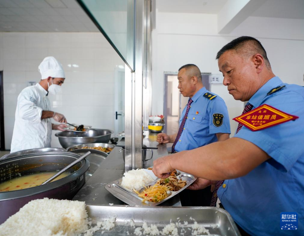 在西格尔车站食堂,站长魏万强(右二)和车站值班员王春海(右一)在打饭(9月25日摄)。