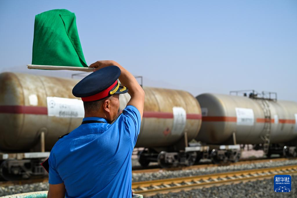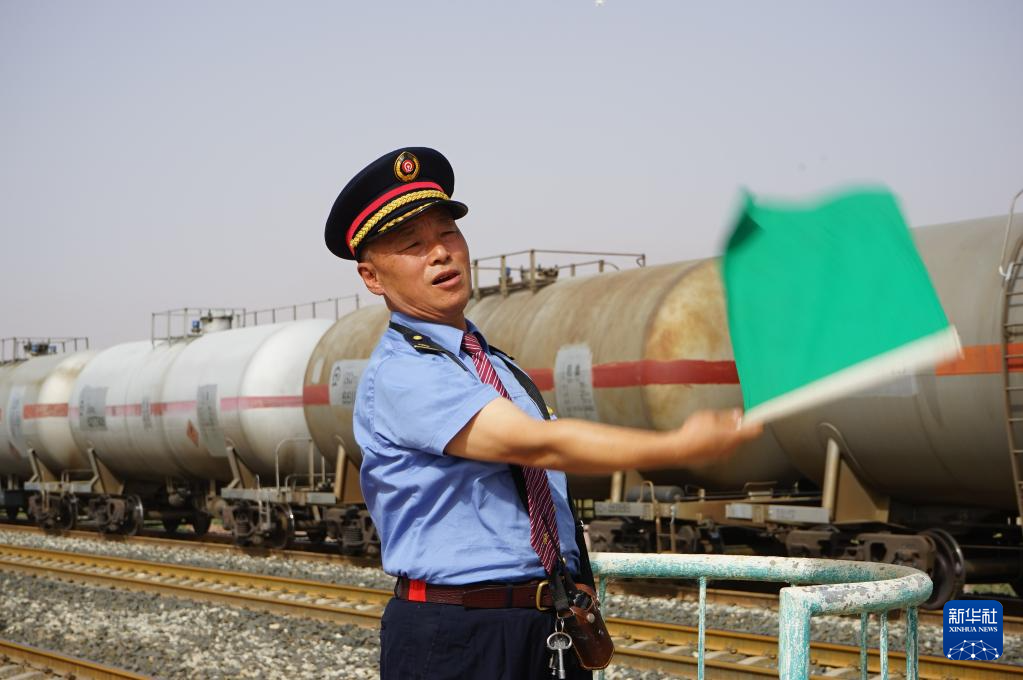 在西格尔车站,车站值班员王春海在站台上用旗语指挥过站车辆(9月25日摄)。