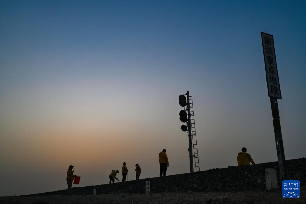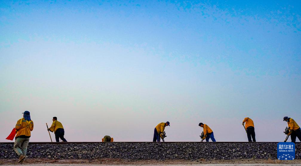 清晨,在五间房车站附近,喀什基础设施段西格尔综合维修车间职工在铁道上进行维保作业(9月26日摄)。