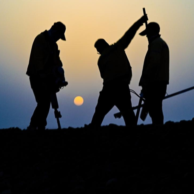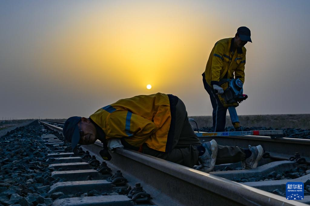 戈壁上,威克镐撞击道砟发出的声音同工人们做伴。太阳升起后,职工工作服上已落上了灰尘。