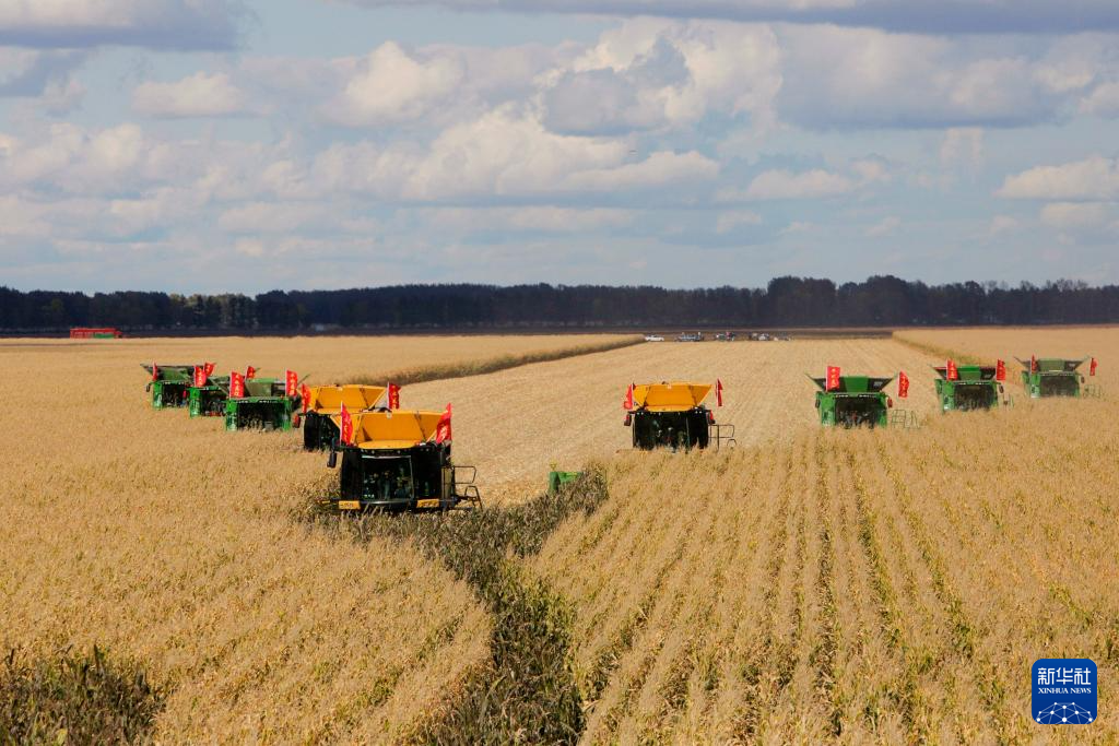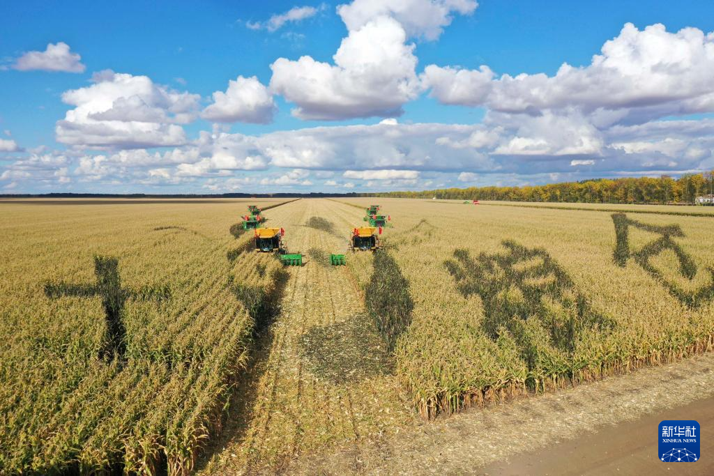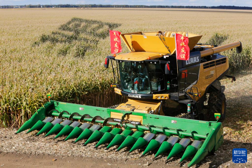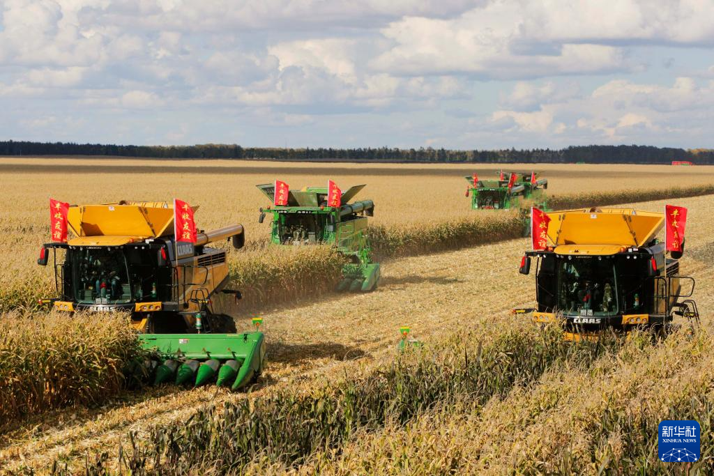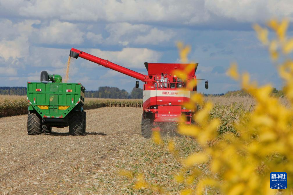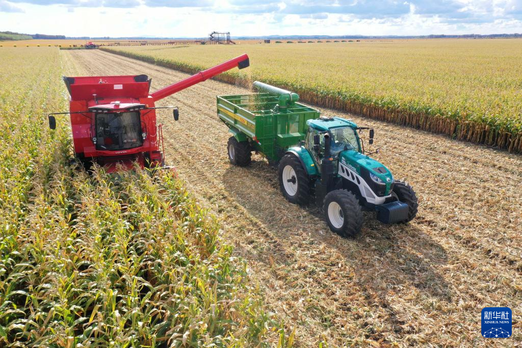 9月27日,农机在位于双鸭山市友谊县的北大荒农业股份有限公司友谊分公司一处玉米种植地块进行秋收作业。