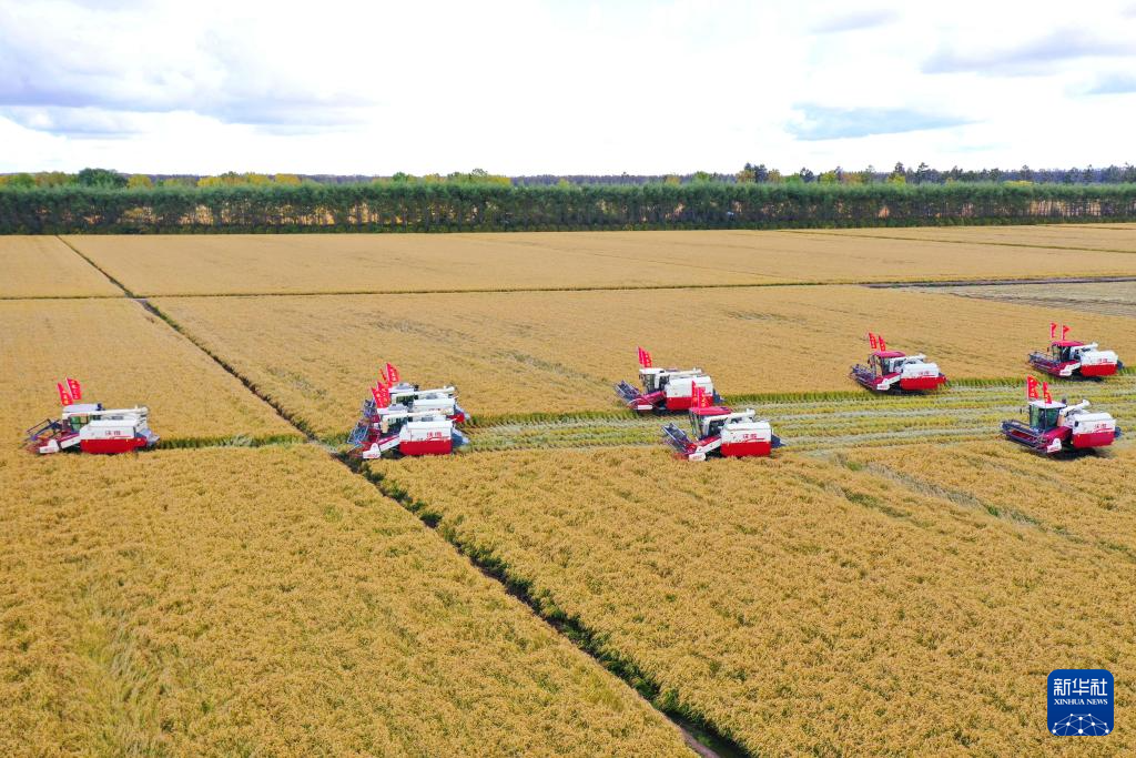 这是9月27日在位于双鸭山市友谊县的北大荒农业股份有限公司友谊分公司一处水稻种植地块拍摄的秋收现场(无人机照片)。