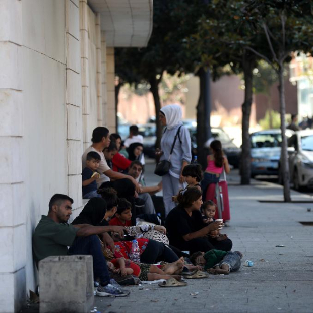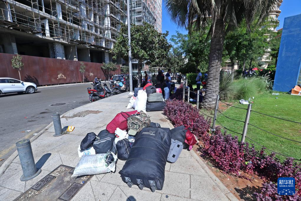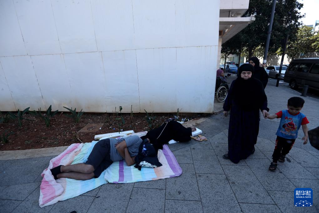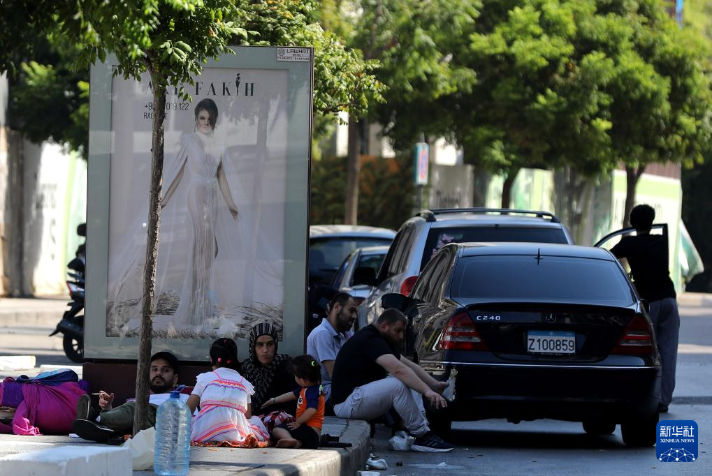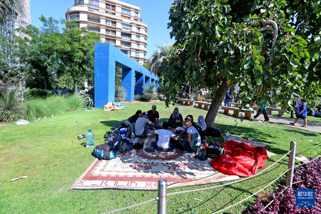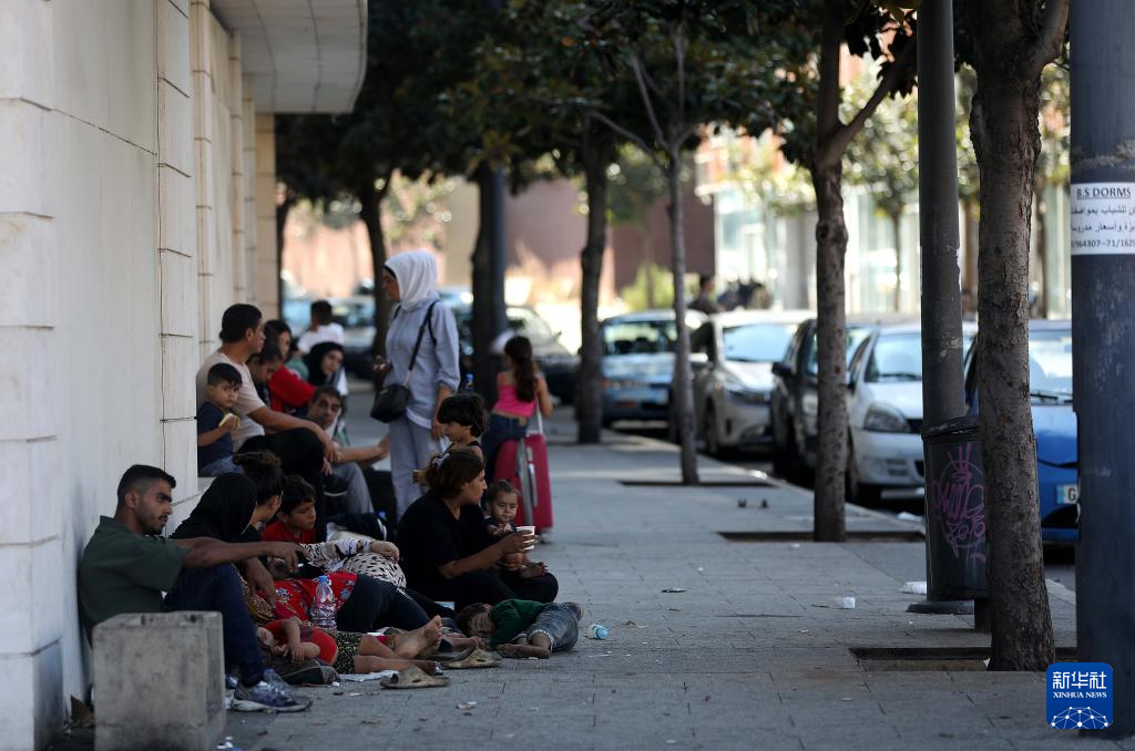 这是9月28日在黎巴嫩首都贝鲁特市中心拍摄的从贝鲁特南郊逃离的流离失所者。