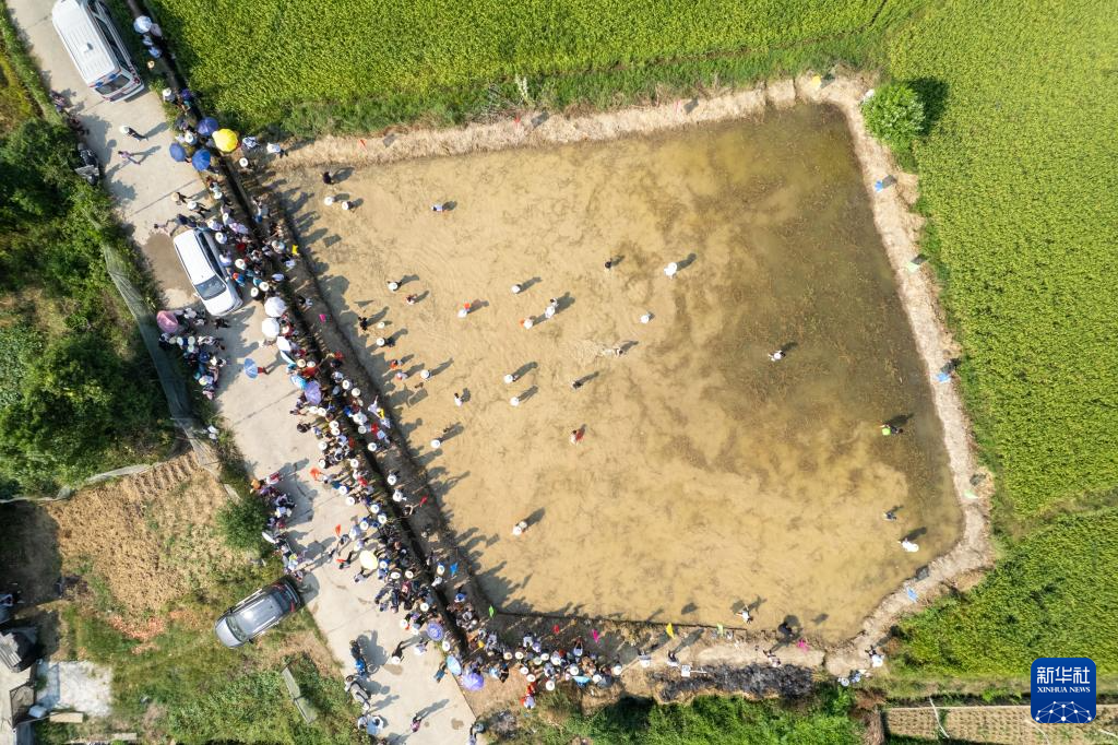 9月28日,在桃江县高桥镇荷叶塘村,村民在进行稻田摸鱼比赛(无人机照片)。