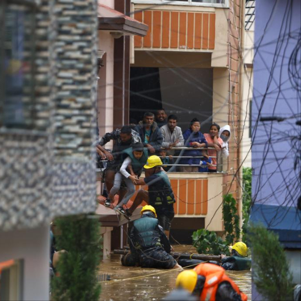 9月28日,在尼泊尔勒利德布尔,救援人员营救受困人员。