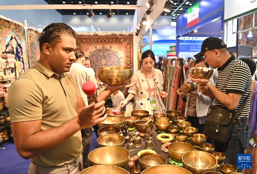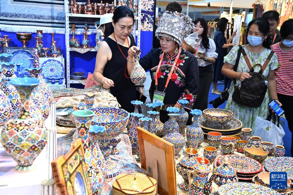 9月28日,观众在第21届中国—东盟博览会上挑选伊朗商品。