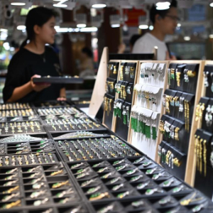 这是9月27日在揭阳百分玉器广场拍摄的翡翠商家摊位。
